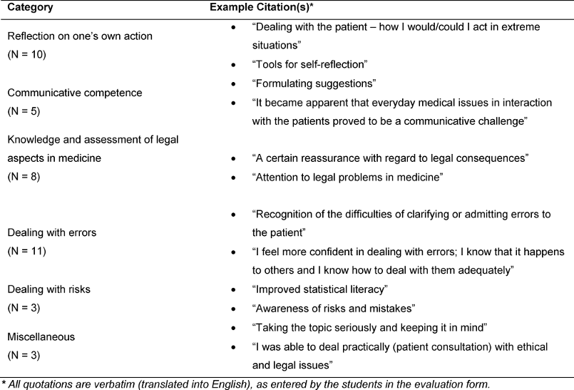 Effects and changes (see Table 4 [Tab. 4]) were identified by the students referring to their knowledge of legal aspects, reflection on their own actions and the training and further development of communication competencies. Additional feedback on the effects of the courses related to the impetus provided in the course for the appropriate handling of risks and errors.