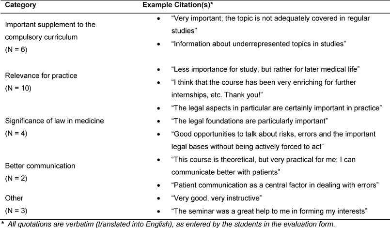 The project report is based on the experiences of four elective courses and written comments from 32 participating students. The qualitative methodology chosen facilitates a detailed understanding of the perceptions and evaluation of the course from the students’ perspective. Thus, the existing assumptions on the part of the lecturers regarding the value of the methodological approach chosen for the integrated communication of ethical, legal and communicative content and its practicability could be compared with the students’ perspective. In the light of the small number of responses from a selected cohort of students with above average motivation, we assume that these evaluation results cannot be applied to all students (limited representation). Furthermore, the qualitative analysis of free text answers as an explorative approach always represents an interpretative act by the evaluators, so that despite efforts to achieve transparency and traceability in the evaluation steps, subjective definitions are part of the evaluation as presented here.