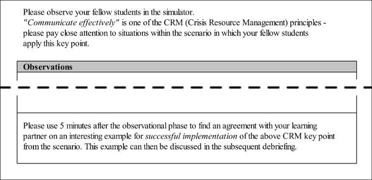 The collaboration script in this study induced the learners in the script condition (n=14) to perform specific activities, assigned an order to these activities, and also assigned roles to the learners [10]. The script design structured individual learning processes during the observational phases by drawing the students’ attention to specific CRM heuristics during the observation. Each student in this group was given the task to observe the students in the simulator on the basis of a single CRM principle and to take notes. The principles to be observed varied throughout the observational phases; subgroups of two learners were provided with collaboration scripts focusing on the same CRM principle. The collaboration script also assigned roles to each of the two learners: The analyst for positive situations had to pay attention during the scenario to situations in which fellow students successfully applied the CRM principle and present those situations during the collaboration phase. In contrast, the analyst for negative situations had to focus on situations in which CRM principles were not applied or were applied in an erroneous fashion and report on those. During the collaboration phase, learners in each dyad had to jointly decide on one interesting example of a successful implementation as well as one of a less successful implementation of their respective CRM principle from the scenario (see figure 2 [Fig. 2]). In order to allow for a change of perspectives, leading to deeper elaboration and more comprehensive understanding of the content [9], learners had to switch roles after each scenario. Each individual phase of observation lasted about 20 minutes, and the following collaboration phase took 5 minutes.