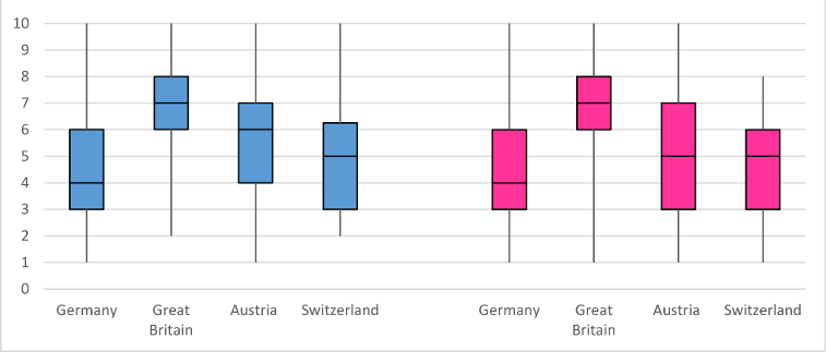 By comparison, the participating students from Great Britain stated better preparation for their clinical activities on average with 6.70 (±1.85) (1=not satisfied – 10 very satisfied) than students from Austria 5.29 (±2.24), students from Switzerland 4.70 (±1.88) and students from Germany who on average only stated 4.32 (±2.00) The results of the individual countries were significant.