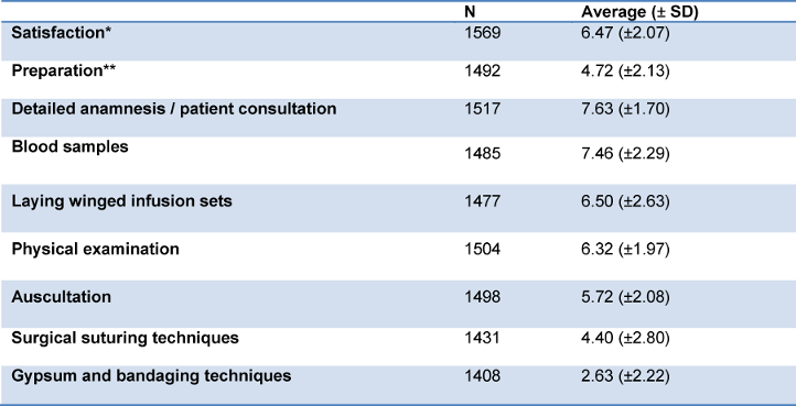 - The self-assessed state of preparation for the requested seven clinical skills which are required during the practical year and at the beginning of the clinical everyday activities of doctors (patient consultation and anamnesis, physical examination, auscultation, gypsum and bandage dressing, suture techniques, venepuncture and laying of indwelling catheters) (scale 1 to 10).