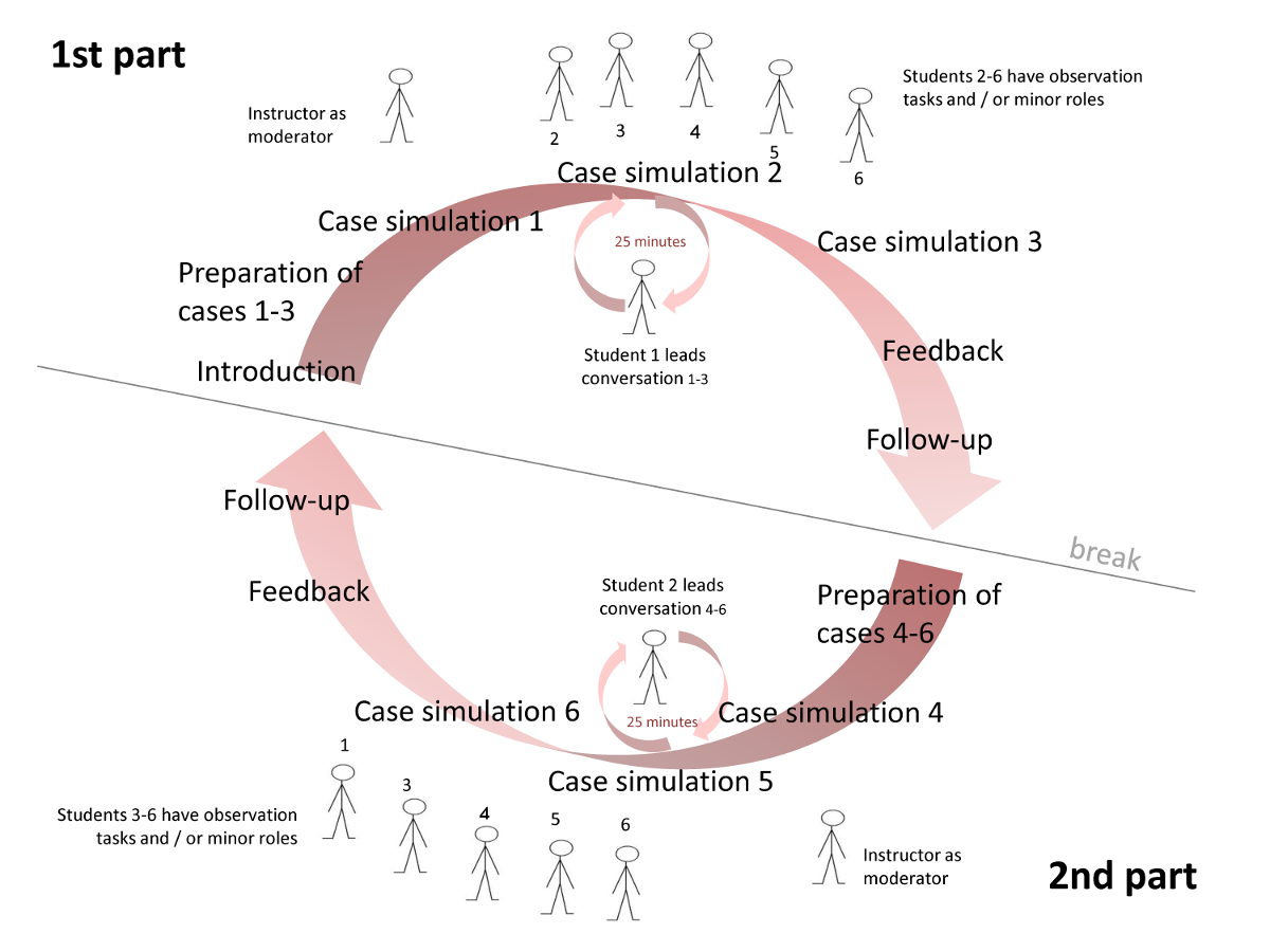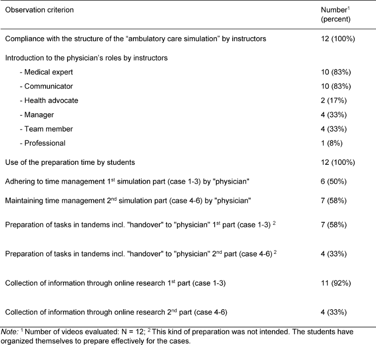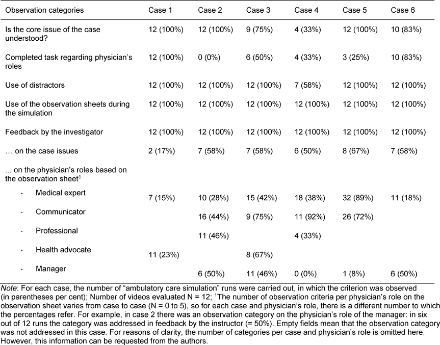 For 12 runs of the “ambulatory care simulation”, instructors and all participating students signed an informed consent form to film the run. Videos were used to assess whether physician’s roles were addressed by the instructors during the introductions and debriefings and whether the intended physician’s roles were addressed in the cases. Seven different instructors moderated the runs. Two instructors had been involved with the teaching format from the beginning and also participated in the development of the cases. The other five instructors were introduced to the teaching format and moderated the runs at least two times.