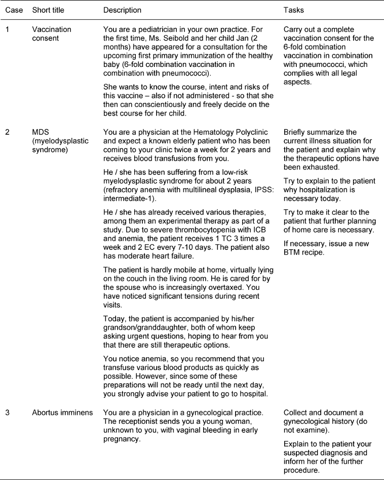 Each instructor received an instructor's folder containing information on the introduction and a process overview of the “ambulatory care simulation” including precise descriptions of all cases and comments. Copies of all other materials were made available to both the students and the instructor. This included the tasks for the cases and the case-related observation sheets. To prepare for the “ambulatory care simulation”, each instructor was trained to precisely identify with the students the physician’s various roles in the cases. The preparations were adjusted to fit the schedule of each instructor and took up 45 to 60 minutes.