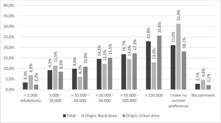 Figure 1 [Fig. 1] shows the preferred number of inhabitants living in the future place of work. A statistically significant correlation exists between the variables of own background and desired place of work with a moderate effect size (r=0.366; p<0.001; N=458) [20]. Almost one third of participants from rural communities said they had no preferences with regard to future place of work.