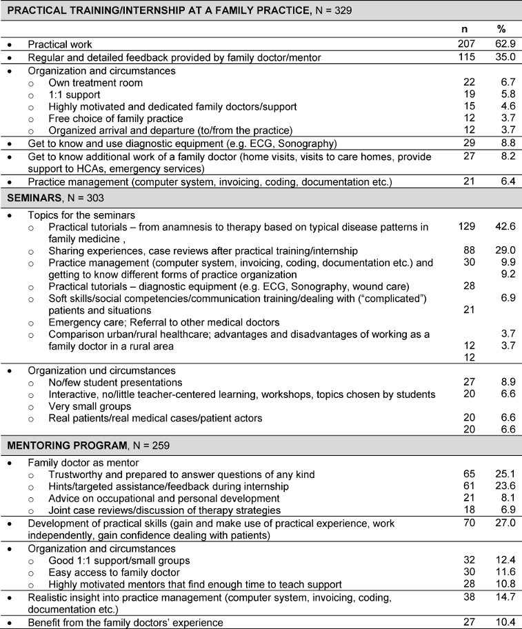 To structure the priority program, the students were first provided with a preliminary concept (part I: training in a practice; part II: accompanying seminar; part III: mentoring program). Around one half of participants took the opportunity to formulate their own requirements of a rural health program in general practice and express their own ideas in free text.