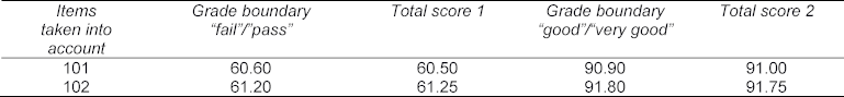 If he has achieved 91.00 points in the marked items, thus gaining “very good” (the boundary is 90.90 points at 101 items) then taking into account the flawed item produces a total score of 91.75 which is not sufficient to achieve the boundary of 91.80 points for a “very good” at 102 items (Table 1 [Tab. 1], column "grade boundary good/ very good" and "total score 2").