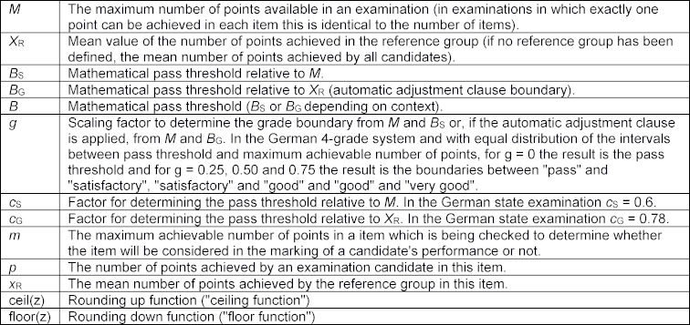 In most degree or examination regulations, absolute and relative pass thresholds ("automatic adjustment clause") are stipulated. If M describes the maximum number of points achievable (note that in examinations such as the state examinations, in which one point can be achieved for each item, M agrees with the number of items), and XR describes the mean score achieved in the examination (if a reference group has been defined, use the mean value in this group), then the absolute pass threshold BS and the relative pass threshold BG are determined in accordance with the automatic adjustment clause using two constants cS or cG.