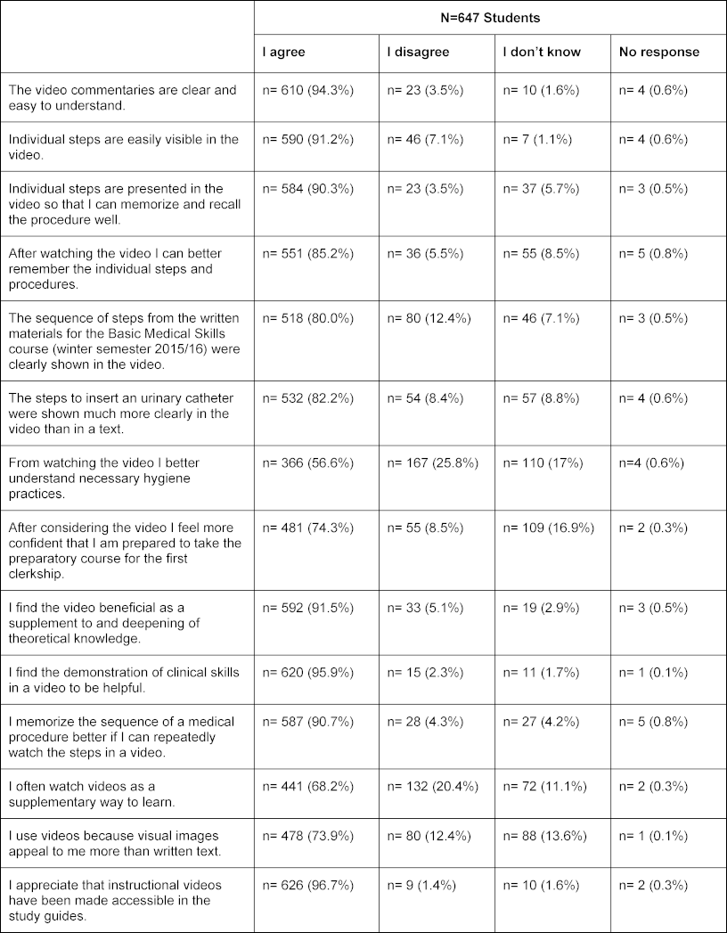 After viewing the instructional videos, students were asked to fill out an online questionnaire on Moodle with 15 questions. Questions about video quality and acceptance were asked (see table 1 [Tab. 1]).
