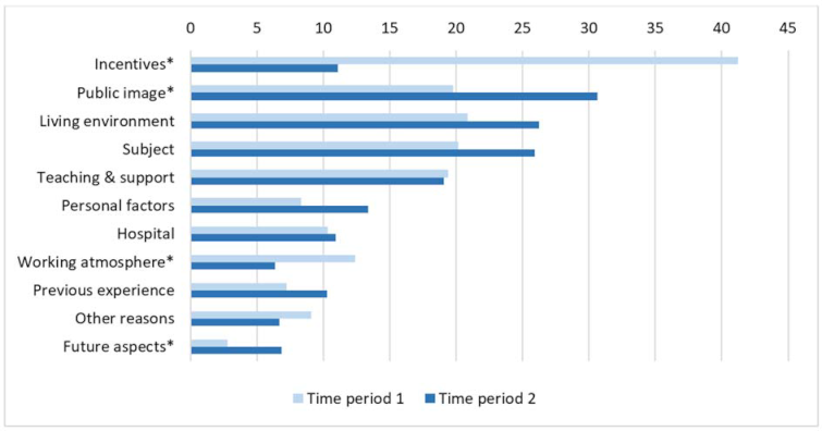 In addition to comparing the main categories (see figure 1 [Fig. 1]), the subcategories were ranked over both time periods for the University Hospital and the teaching hospitals. The most frequently cited reasons are, with reference to 355 questionnaires with a desired location, University Hospital: Subject (26%), Proximity (16%), Doctoral thesis (11%), University & large institution (10%) and Previous experience (10%). In reference to 387 questionnaires with a teaching hospital as the desired location, Financial incentives (36%), Proximity (27%), Recommendation (20%), Small institution (15%), Good support (12%) and Working climate & team (11%) were mentioned most frequently.