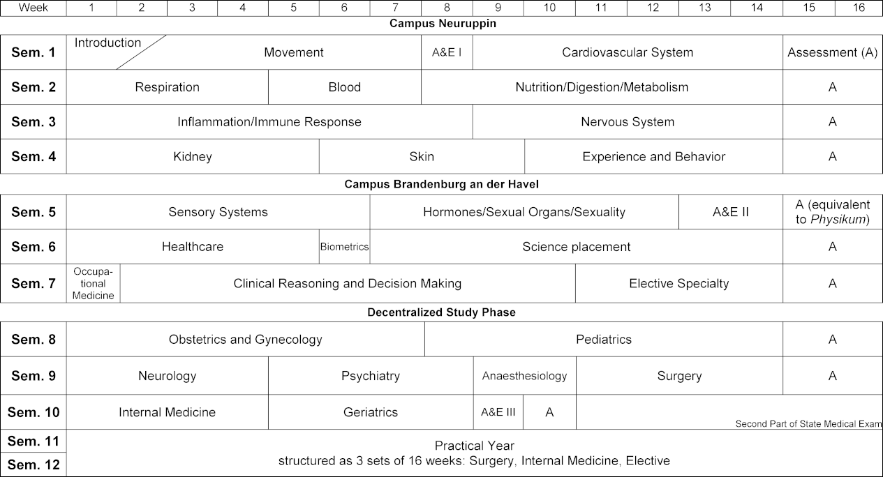The Brandenburg Reformed Medical Curriculum (BMM) is based on experience with the reformed medical curriculum at Berlin’s Charité [5] and has been further developed and adapted to meet the aims of MHB and the needs of a small faculty in the process of being established. The curriculum complies with the model curriculum clause (§41 ÄAppO), as well as other requirements laid down in the medical licensing regulations and EU Directive 2005/36/EC.