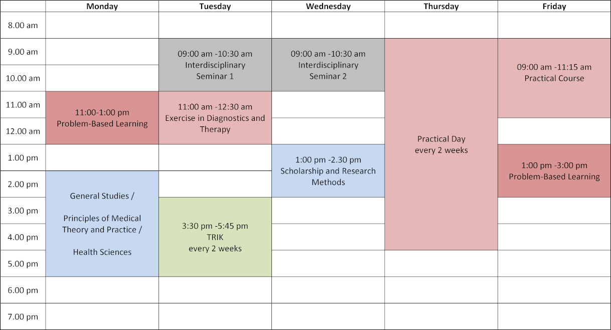 The few lectures are used to provide introductions to complex topics and overviews of a topic. Medical subject knowledge is primarily taught in interdisciplinary seminars (IDS), which are designed around a specific topic by two instructors from different specialties, usually from the basic sciences and clinical subjects. This interdisciplinary approach links learning material in the different subjects (mainly anatomy, biochemistry, physiology) and the subjects in clinical theory (mainly pathology, microbiology, pharmacology) with the content of the clinical subjects.
