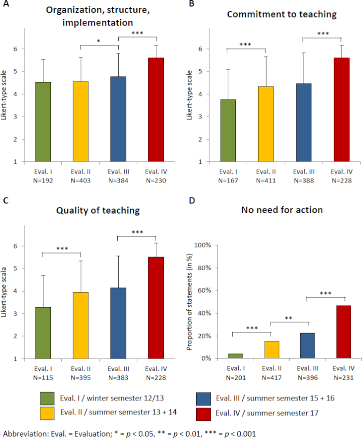 In summary, the present study shows how a course can be continuously developed in small steps to the benefit of the students. It is thereby noteworthy that each optimization of the various aspects of a course, such as structural, content- and teaching-related, and methodological characteristics, can help to improve student satisfaction. Thus, different approaches can be used, depending on the local conditions.