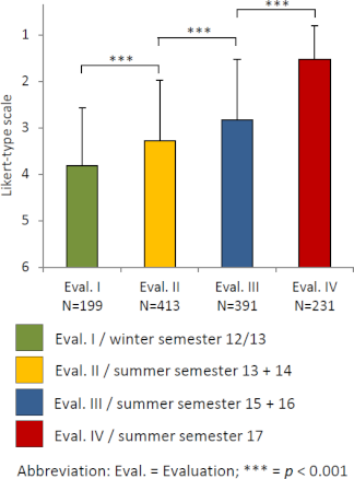 The validity of student evaluations can be viewed critically [27]. Nevertheless, the data presented here show that student evaluations can be used to depict optimization of a course in small steps, at least to a limited extent. For example, the student evaluations of “organization, structure, implementation” did not change between WS 2012/13 and SS 2013, but they did between the SS 2014 and SS 2015. It is also necessary to draw attention to their limits, however. For example, we could only evaluate the SS 2017 results on “commitment to teaching” and “quality of teaching” in a more differentiated way in association with the results of the pilot study. In the same way, we could only largely rule out effects of the cohort by comparing the results of the pilot study, which was performed within one cohort, with those of the current study. The usefulness of evaluation results also depends on how differentiated the inquiry is, as the discussion on the second development step shows.