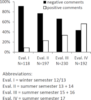 The poor overall evaluation and the clear need for action in the evaluation of the WS 2012/13 formed the starting point for the optimization of the seminar. An analysis of the free texts revealed worthwhile steps that could be taken, illustrating the usefulness of student evaluations.