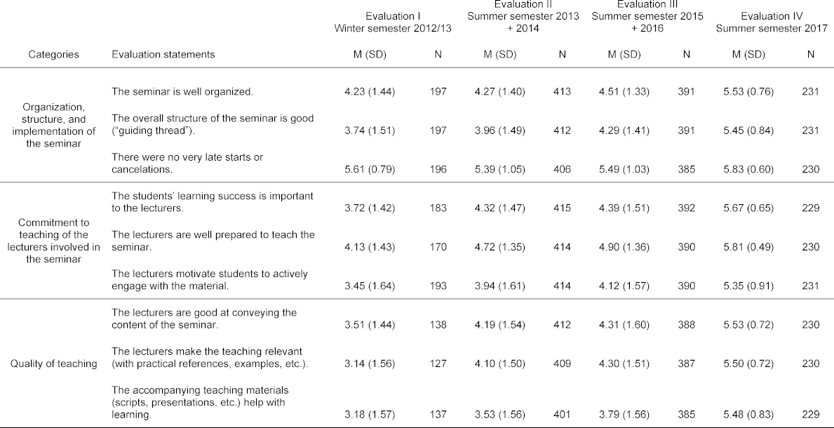 Table 1: Statistical parameters of each evaluation statement that make up the scales for evaluating the seminar: “Organization, structure, and implementation of the seminar,” “Commitment to teaching of the lecturers involved in the seminar,” and “Quality of teaching.” The evaluation statements were assessed on a Likert-type scale ranging from 1=“does not apply at all” to 6=“fully applies.” Evaluation data from the pilot project 2016 were not included in the analyses.