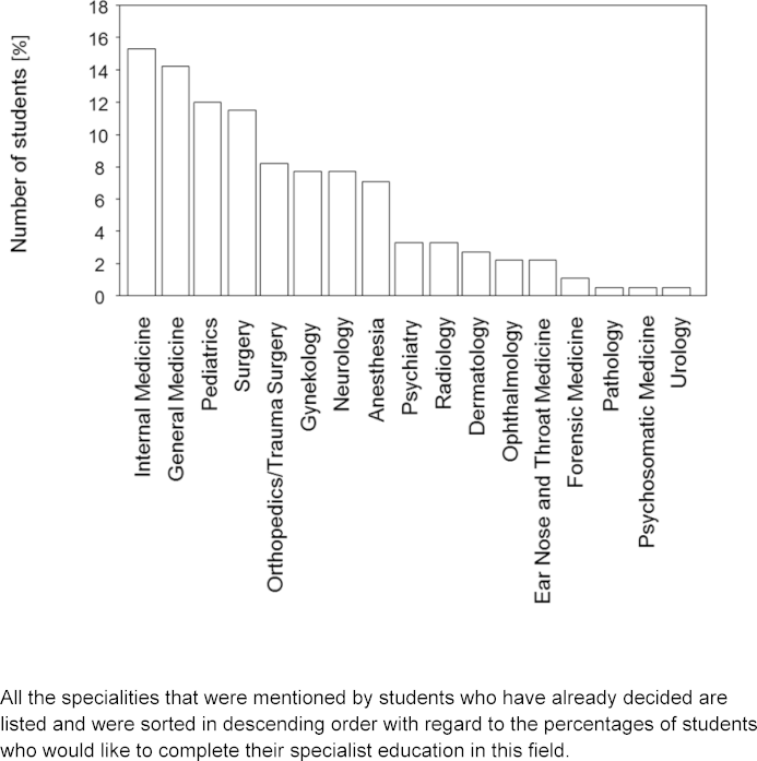 Figure 2: All the specialities that were mentioned by students who have already decided are listed and were sorted in descending order with regard to the percentages of students who would like to complete their specialist education in this field.