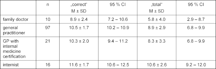 Comparable results were found in the 13 questions on internal medicine. The PTM-GP scores of the four specialist groups were examined by using the non-parametric Kruskal-Wallis test. Moderate significant differences in the PTM-GP scores of the specialist groups for "correct" (χ2=11.3, p=.010, d=.473), “false” (χ2=13.4, p=.004, d=.533) and “total” (χ2=12.1, p=.007, d=.496) became clear and are shown in table 3 [Tab. 3].