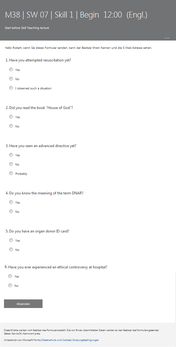 In the online seminar, as an activating tool or teaser, we started with a Microsoft Forms survey asking about their prior experience with resuscitation if any, their role therein, and general attitude towards ethics in medicine (see attachment 1 [Att. 1]). Our introductory survey revealed that 72% of our 156 students had not witnessed or assisted a resuscitation effort but 28% had. Most had seen advanced directives but only half of them knew the term “DNAR” (do not attempt resuscitation). An organ donor ID card is carried by 84% of them. Only 53% reported having witnessed an ethical dilemma during their studies or in their life. The results were then discussed with the students sensitizing the group to everyday ethical dilemma they had inadvertently overlooked.