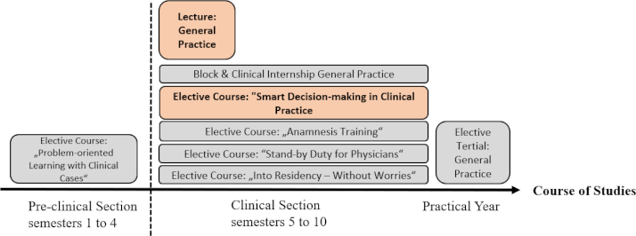 At the Friedrich-Alexander-Universität Erlangen-Nürnberg (FAU), general practice is anchored in the 1st clinical semester as a lecture with two semester hours per week (SWS). The internship is to be completed from the 5th to the 10th semester. (Pre-)clinical elective courses are offered. The practical elective part can be completed in the final practical year (see figure 1 [Fig. 1]). In the summer term 2020, the “Lecture General Practice” and the clinical elective course “Smart Decision-making in Clinical Practice” were offered digitally. Other elective courses could not be offered digitally due to the highly practice-oriented interactive setting (e.g., small groups, role-play), or – after suspension – were offered again in analogue form (clinical traineeship, internship, elective part).