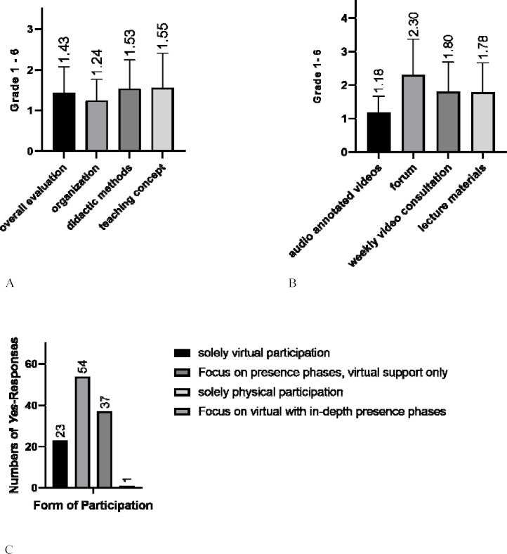 Results: The main lecture (response rate n=115/170; 67.6%) was rated “very good” on average. The same applies to the commented videos. The forum, reflective video consultation and teaching materials were rated “good” on average. The predominantly desired forms of presence were “Focus on virtual with in-depth presence phases” (n=54) and “Focus on presence phases, virtual support only” (n=37).