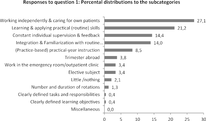 Figure 3: Percental distribution of the mentions to the subcategories for question 1: Which aspects of the practical year contributed in particular to you feeling prepared to pursue your profession?
