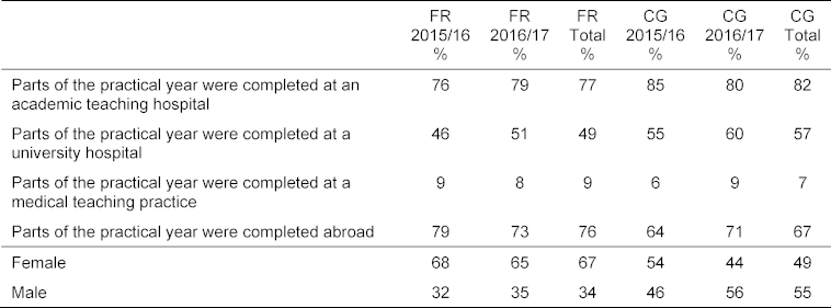 The data for the 2015/16 and 2016/17 graduating classes from all of the medical schools in Baden-Württemberg were included in the analysis. The results for the Freiburg University graduates, who voluntarily participated in the survey (NFR_Jg.15/16=88; NFR_Jg.16/17=112), were compared with the compiled results for the four other medical schools in Baden-Württemberg (NVG_Jg.15/16=293; NVG_Jg.16/17=224). The response rates were 29% and 36%, respectively. Basic characteristics of the surveyed Freiburg cohorts and the comparison group are presented according to year of graduation in table 1 [Tab. 1].
