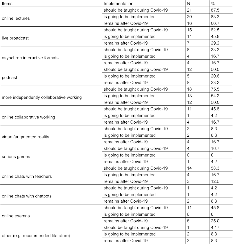 We are aware that our results are limited as they represent teachers from only one medical facility, and the numbers of participants was limited to 24. However, we think that it might be of interest to explore how medical training could be implemented in times of COVID-19. With regard to data analysis, we need to consider that the mean imputation might lead to a bias of variance. However, the overall mean of missing values was estimated at 1.28%, which is very low.