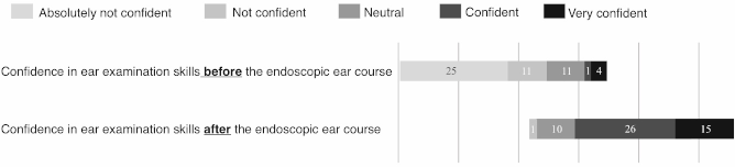 We believe that a higher self-reported confidence level should be one of the main goals of any skill teaching module, although such outcomes do not always correlate to better diagnostic performance [22]. Thus, we propose that undergraduate teaching programs should invest in endoscopy and digital camera systems for the teaching of ear examination. The potential to attach digital cameras to endoscopes allows the teacher (and other students) to simultaneously observe what the examiner is seeing, and vice versa, thereby resulting in a more controlled and uniform learning experience for all students regardless of their individual performance skills. In addition, camera recordings are conducive to both virtual learning and the exchange of experience among students and teachers.