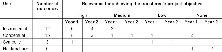 Table 4: Overview of the knowledge transfer outcomes by use, relevance, and project year