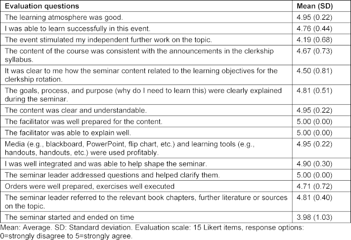 After revising the seminar concept and piloting it for three months in the 2021 geriatric psychiatry clinical rotation (n=27 students, 6-point Likert item on global assessment), global assessment was evaluated in comparison to previous seminar evaluations from 2019 (clerkship seminar evaluations from eight months, n=83 students) (Wilcoxon rank-sum test, unconnected sample because students were from different clerkship cohorts). Effect size was calculated using Cohen's d for nonparametric tests [20]. For two implementations of the revised clinical rotations, an additional written multidimensional evaluation (5-point Likert items (n=15 items), plus three open-ended questions) was conducted on learning climate, lecturing aspects, and media use, among others. The questions of the evaluation form are listed in table 1 [Tab. 1] and in attachment 2 [Att. 2].