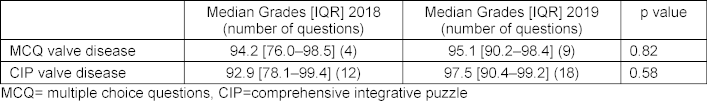 When we compared the grades of the valve related and non-valve related questions in 2018 and 2109, we could not find significant statistical differences. There was a tendency for higher grades in valve-related MCQ questions and narrower variances in 2019 (see table 2 [Tab. 2]), as was the case for valve-related questions in the CIP part of the test (see table 2 [Tab. 2]) but these differences were not statistically significant.