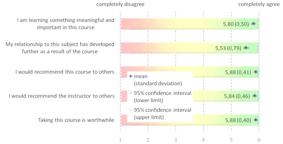 All of the questions are rated by marking a six-point Likert scale (e.g., “Taking this course is worthwhile.” 1=completely disagree; 6=completely agree).