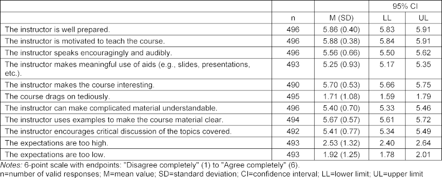 The reasons given by students for taking the course include: the opportunity to earn academic credit (87%), general interest in the subject matter (56%), recommendation by participating students (11%), instructor (5%) and course’s structure as a block (5%). The mean values, standard deviations and confidence intervals are presented for the different aspects of the evaluation in table 1 [Tab. 1], table 2 [Tab. 2] and table 3 [Tab. 3].