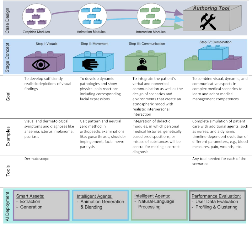 Medical tr.AI.ning is scaled to four complementary developmental steps with different scenarios that can be used separately and so each outcome can successively be integrated early within the project. Every step has its own focus (visual, movement, communication, combination) and extends an author toolbox through its modularity. The modules of each step will be specified and designed together with medical didactics experts.