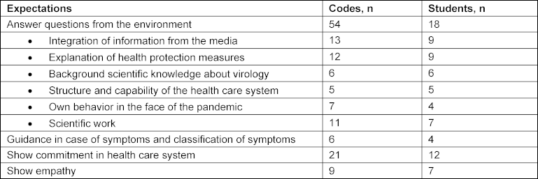 Results: The results showed shifts in students’ perception of the importance of certain aspects of medical professionalism. Not only competency in the disciplines hygiene, virology, and microbiology came to the fore, but also personal qualities such as “radiating a sense of calm”, empathy, and altruism; communicative competency; and the capacity for reflection. The students also perceived changes in the expectations placed on them. More emphasis was placed on their roles as scientific or medical advisors and as helpers in the health care system, a change that was sometimes emotionally stressful. With respect to the study objective, both limiting and supporting factors were named. For example, the clarification of the relevance of the medical professional was motivating.