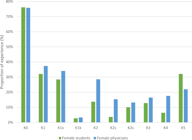 Figure 1: Relative Frequencies of GBD experience per category. Note: NStudents=109 and NPhysicians=91. K0=Proportion of women surveyed with GBD experience, K1=Sexual harassment and/or sexist verbal assault, K1v=Verbal harassment, K1k=Physical harassment, K2=Discrimination due to existing/possible motherhood, K2s=Structural discrimination based on existing/possible motherhood, K2v=Verbal discrimination based on existing/possible motherhood, K3=Direct preference for men, K4=Direct neglect of women, K5=Degrading treatment based on gender