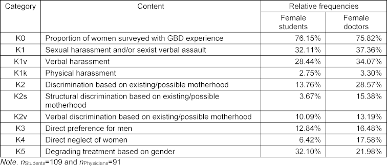 Methods: Female medical students (n=235) and female physicians (n=157) from five university hospitals in northern Germany were asked about their personal experiences with GBD in an online survey on self-efficacy expectations and individual perceptions of the “glass ceiling effect” using an open-ended question regarding their own experiences with GBD. The answers were analyzed by content analysis using inductive category formation and relative category frequencies.