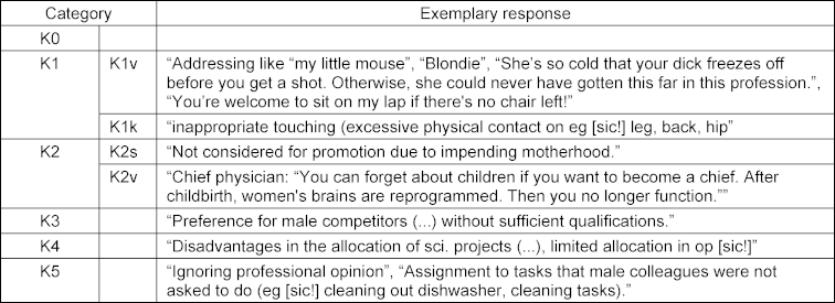 392 women participated in an online survey on GBD, self-efficacy expectations, and individual perceptions of the “glass ceiling effect” in a medical context in 2019. The survey was conducted as a stand-alone study with funding from the Göttingen Psychological Institute. Female physicians surveyed, were recruited via newsletters from their respective clinics, and female students were recruited via social networks, flyers, and notices in the clinics and universities. All persons who identified with the female gender were addressed. 157 of the respondents were female physicians (MAge=35.35, SD=8.92), and 235 were female medical students (MAge=23.95, SD=3.69). Participants came from five university hospitals in northern Germany. In addition to standardized questions on self-efficacy expectations and individual perceptions of the “glass ceiling effect”, the following question was asked to elicit personally experienced GBD: “Have you already had discriminatory experiences at work, in your studies or internship, or the like, because of your gender? If yes, which ones?” The written responses to this question are the subject of this paper. They were analyzed qualitatively according to Mayring’s method of inductive category formation [33]. In this procedure, the statements are summarized step by step in terms of their essential content. This is done in a documented process that includes paraphrasing the statements (i.e., cleaning up redundancy) and several steps of reducing the content to a uniform level of abstraction until finally categories and subcategories are available that condense the respondents’ statements. The content categories extracted from the responses were examined in a second quantifying step to determine how frequently they were mentioned by the female students and physicians surveyed. In accordance with the standard of qualitative research, the responses were coded by a mixed-gender group, and the results were reviewed and interpreted together discursively. In the process, the authors’ own feminist views and their own gender roles were particularly reflected upon.