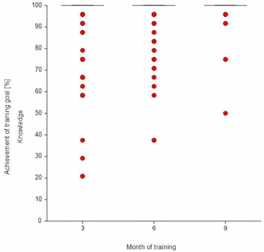 Figure 4: Competence development throughout basic training: Self-judgement on learning objectives with a target level of “K” at the end of the 3rd, 6th and 9th months. In the 3rd month, the median, 75th percentile and 25th percentile overlap at 100%. The number of outliers decreases over time.