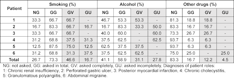 Overall, in the 91 histories the students asked about the patients’ smoking behavior in 73.3% of the cases, about alcohol in 58.9% and about other drugs in 16.7% (see table 2 [Tab. 2]). In part, there were significant differences between the six patient cases. In total, in only 14 histories (15.4%) all three substances were inquired. In none of the interviews were all substances fully inquired. In 59.3% of the cases in which substances were inquired, there was no information on the quantity, frequency or duration of use. No questions were asked about the type of consumption (e.g. cigarettes, cigarillos etc.) in the case of smoking or other drugs. When alcohol was discussed, the type of consumption (e.g. beer, wine, etc.) was asked in 1.9% of cases.