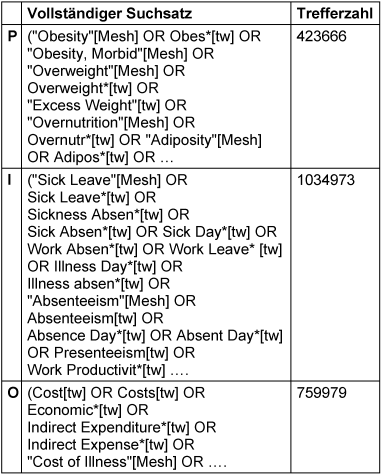 Es sollte für den Auftraggeber möglich sein, die Suchbegriffe eins zu eins mit Kopieren und Einfügen zu übernehmen und die Recherche in den Datenbanken zu wiederholen. Aus diesem Grund ist es empfehlenswert die Suchsätze tabellarisch mit den jeweiligen Treffermengen aufzuführen. Für PubMed würde es beispielsweise so aussehen, siehe Tabelle 3 [Tab. 3].