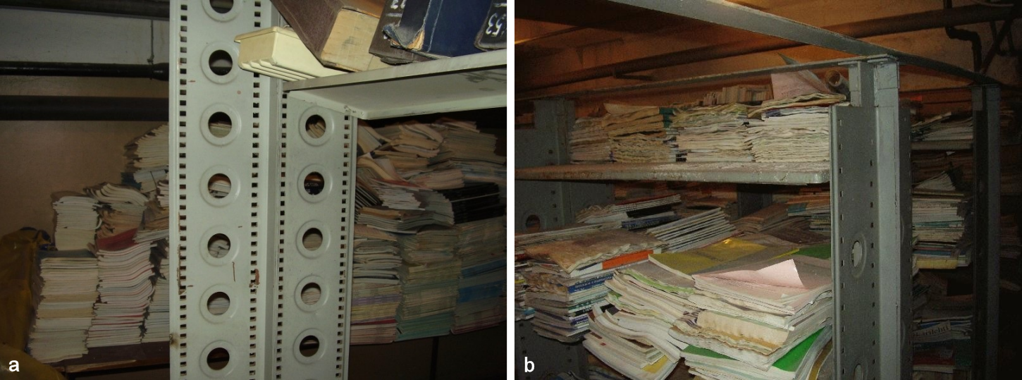 Abbildung 3: Im Keller der Zentralen Medizinischen Bibliothek (ZMB) in Moskau. Gestapelte, nicht zugängliche Zeitschriften der Jahre 1990–2010 (a) und Zeitschriften mit Wasserschaden (b).