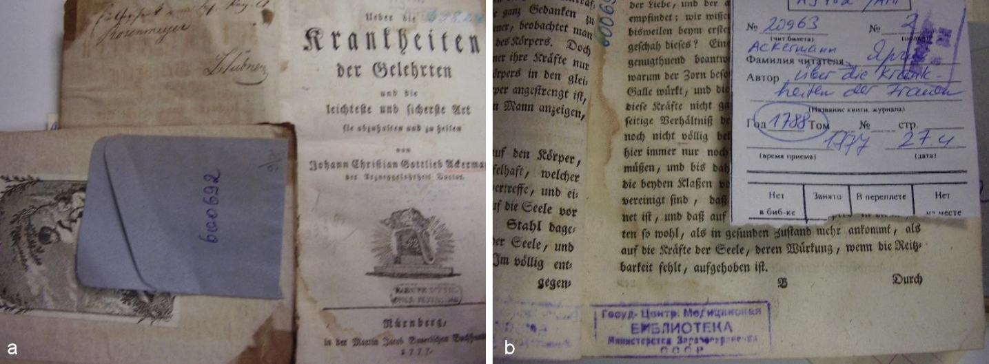 Abbildung 4: Wertvolle, beschädigte Bücher der Zentralen Medizinischen Bibliothek (ZMB) in Moskau aus dem 18. Jahrhundert [7], [8]. Eine Papiertasche ist über die Gravüre geklebt und Wasserschäden sind sichtbar (a). Ein Stempel der ZMB und sichtbare Wasserschäden (b).