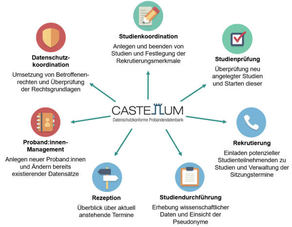 The use of Castellum has so far been particularly successful for institutions conducting research in the humanities that carry out several studies in parallel, that want to proactively recruit participants from an internal pool of interested persons after they have given their consent (recruitment consent), and that generate data when dealing with these participants.