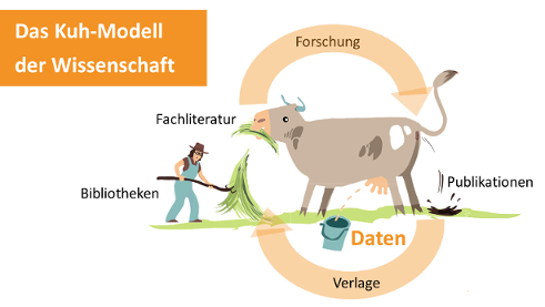 Im Kuh-Modell der Wissenschaft (Abbildung 1 [Abb. 1]) stellt sich die Wissenschaft als ewiger Kreislauf dar, beginnend mit der Fachliteraturzufuhr, Verarbeitung durch die Forscher*innen, „Ausscheidung“ von neuen Publikationen und der Veredelung dieser durch die Prozesse der Verlage zu neuer Fachliteratur. Während dieser Ablauf seit langem unverändert passiert, hat die Digitalisierung ein neues Element hinzugefügt: Die entstehenden Daten – im Modell repräsentiert durch die Milch.