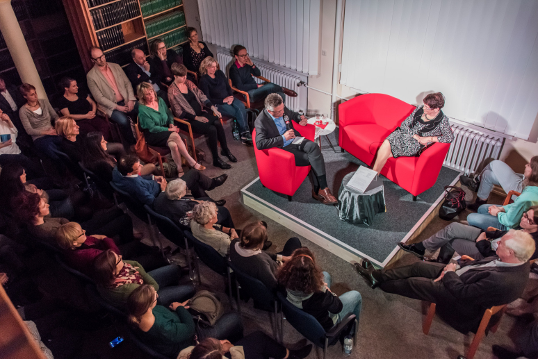 Abbildung 2: Salon moderiert von Henriette Senst mit Prof. Dr. Christoph Gradmann, im Vordergrund das besondere Stück „Untersuchungen über die Aetiologie der Wundinfektionskrankheiten“