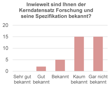 Erfahrungsberichte aus anderen Ländern veranschaulichen die Bedeutung einer engen Verschränkung von Forschungsinformationssystemen und institutionellen Repositorien für das institutionelle Forschungsinformationsmanagement und stellen die wichtige Rolle der Bibliotheken, u.a. bei der Bereitstellung und Integration von Outputdaten, dem Forschungsdatenmanagement und der Open-Access-Verwaltung, heraus [15], [16], [17]. Auch in Deutschland erweitert sich das Tätigkeitsspektrum von Bibliotheken durch die Einführung von Forschungsinformationssystemen und den Bedeutungsgewinn von Open-Science-Maßnahmen [18]. Die Expertise der Bibliotheken ist dabei für die Ausgestaltung der lokalen technischen Systeme sowie eine bedarfsadäquate Weiterentwicklung bestehender Standardisierungsinstrumente von großer Bedeutung. Erste empirische Befunde legen nahe, dass der Kerndatensatz Forschung bisher nur wenigen Bibliotheksvertreter*innen näher bekannt ist ([19]; eine Kurzabfrage im Rahmen der ABMG-Jahrestagung 2018 verdeutlicht Ähnliches, s. Abbildung 3 [Abb. 3]). Eine Auseinandersetzung mit den Inhalten des Kerndatensatz Forschung und seiner Umsetzung könnte ein sinnvoller Schwerpunkt im Themenportfolio der Bibliotheken in der entstehenden Forschungsinformationslandschaft sein.