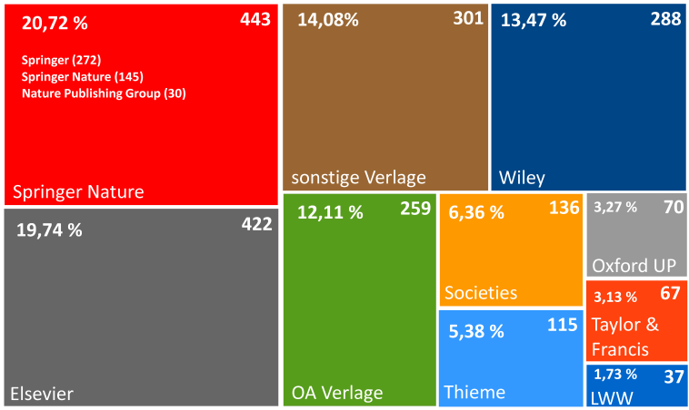 Die DEAL-involvierten Verlage vereinen (als einzeln betrachtete Verlage) die drei größten Anteile auf sich, zusammengenommen 53,9% der Publikationen.