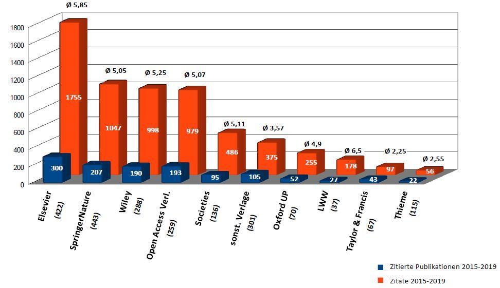 Unter den DEAL-involvierten Verlagen schneidet Elsevier hier am besten ab. Die hohe Gesamtzitationsrate (1.755 Zitationen) der 300 mindestens einmal zitierten Elsevier-Publikationen bestätigt die Bedeutung des Verlages. Jede der 300 mindestens einmal zitierten Publikationen hat im Durchschnitt 5,85 Zitierungen auf sich vereinigt. Der Durchschnitt aller 422 bei Elsevier erschienen Publikationen erzielt ebenfalls mit 4,15 Zitierungen den zweiten Rang.