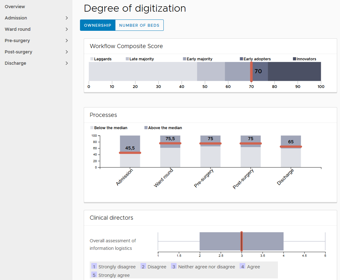 Figure 5 [Fig. 5], Figure 6 [Fig. 6] and Figure 7 [Fig. 7] show screens of the dashboard, which is divided into a navigation bar at the left and a canvas for the diagrams and additional information. When choosing the synopsis view, the Workflow Composite Score (WCS) as the main indicator for the degree of digital support for patient care processes is displayed (Figure 5 [Fig. 5]). The hospital's value is marked as a red bar within the distribution of all WCS values of one of the selected benchmarking reference groups (ownership or bed size). This distribution is divided into the innovation classes according to Rogers’ Diffusion of Innovation Theory [43], which are colour-coded in the diagram. The width of each of these classes indicates the absolute number of hospitals in this class. The next segment displays the individual process scores, which are visualised as a red line in a stacked bar chart with the two halves of the distribution marked with different grey shades. The type of reference group (ownership or size) can be selected in the blue box below the headline. In addition, IT satisfaction data from the clinical users of this organisation is displayed as a boxplot below.